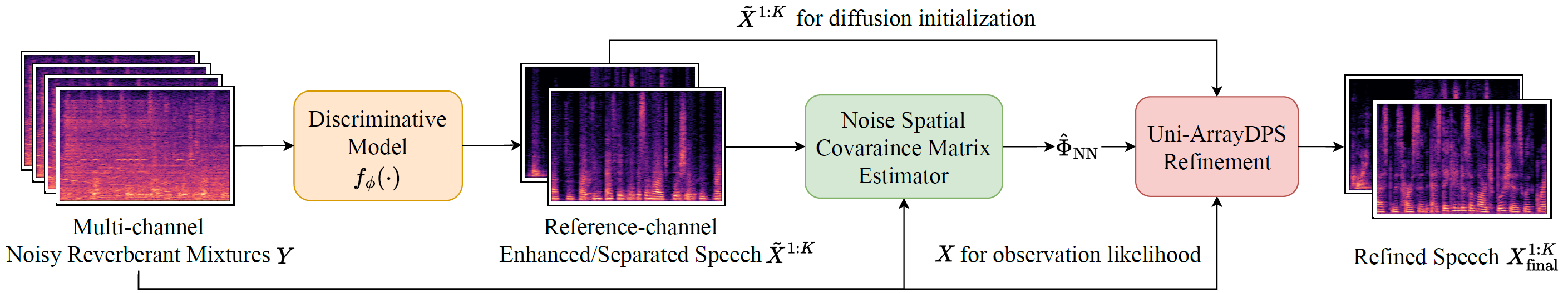 Figure 1 below shows our Uni-ArrayDPS Pipeline. A discriminative model first estimates the clean speech sources. Then the estimated clean speech sources and the noisy mixtures are used to estimate the noise spatial covariance matrix (SCM). The estimated noise SCM is then used for diffusion posterior sampling, which further samples the final clean speech outputs.